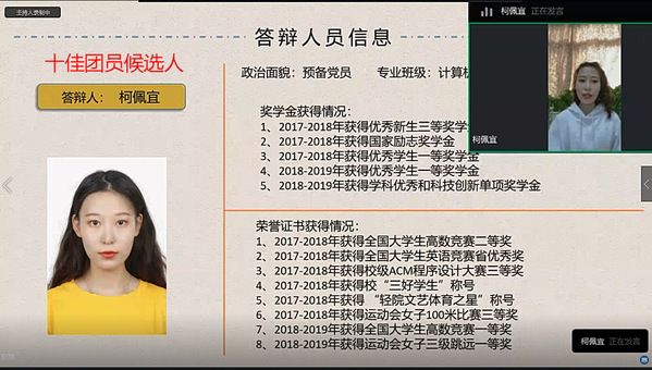 十佳红旗团支部候选单位分别从思想引领作用发挥、基层团组织建设、团支部活力提升、品牌活动打造、学生骨干培养、宣传手段创新、新冠肺炎防控等方面展现了工作理念、工作思路、工作方法及工作成果;十佳团干候选人对过去一年工作思路、具体举措以及特色、亮点工作等进行陈述,把自身在团组织建设、青年大学习、智慧团建、宣传工作、学术科创、社会实践、志愿服务、校园文化建设等方面取得的成果进行了全面展示;十佳团员候选人则是侃侃而谈,全方位地向在场评委展现了他们青春奋斗路上的所得所想,他们中有学分绩连续第一、埋头学海、潜心科研的学术达人,有加创新创业活动,并屡获佳绩科创达人,也有躬身实践、热心公益活动的实践达人,还有活跃于各类文体才艺舞台的文体达人……分别的公开线上答辩会包含自我展示和评委提问两个环节每位同学四分钟精彩纷呈的陈述后,评委老师就陈述中相关的经历、工作进行了个性化提问。各位候选人演讲答辩沉着大方、从容自信,从不同的方式、不同的视角展现出轻工大学子朝气蓬勃、拼搏进取的精神风貌,充分发挥了先进典型的示范带头作用,推动了我校共青团组织工作的开展,展示了我校共青团组织坚实的工作作风。