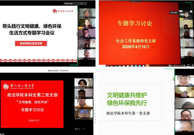 为深入学习贯彻习近平总书记关于生态文明建设和公共卫生安全的重要讲话精神,积极响应落实上级党组织“关于发挥共产党员示范带头作用推动形成文明健康、绿色环保生活方式的倡议”,4月8日-4月17日,政法学院各党支部组织开展了“带头践行文明健康、绿色环保生活方式”专题学习。各支部全体党员参加活动。