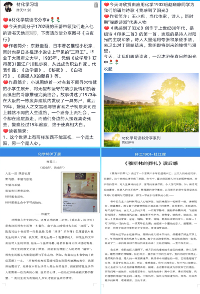 朱熹有诗云:“读书之乐何处寻,数点梅花天地心。”本次活动以“与书同行,不负韶华”为主题,面向全院征集优秀图书分享作品。活动开始后,同学们都积极踊跃地分享了自己的读书推荐作品,作品形式也多种多样,其中包括:读书分享视频、朗诵音频、PPT分享和读书心得等。作品中,同学们抒发自己读书的感受,分享读书的快乐,推荐自己读过的好书:18级丁晨同学在散文《咸也好,淡也好》中学会了淡泊得失的人生态度;19级赵晓静同学在诗歌《我感到了阳光》中懂得了黑暗终将被阳光驱散的人生哲理,活动后期,作品由相关人员进行收集和汇总,并通过材化学习墙进行推送和评选。