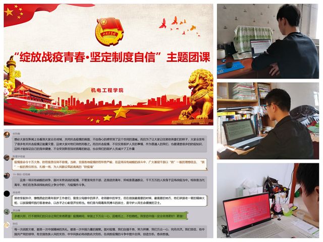 为传承五四精神,激励和引领团员青年进一步坚定制度自信、理想信念,牢记使命担当,4月25日至4月26日,机电工程学院各团支部以直播互动的形式,开展“绽放战疫青春·坚定制度自信”线上主题团课。