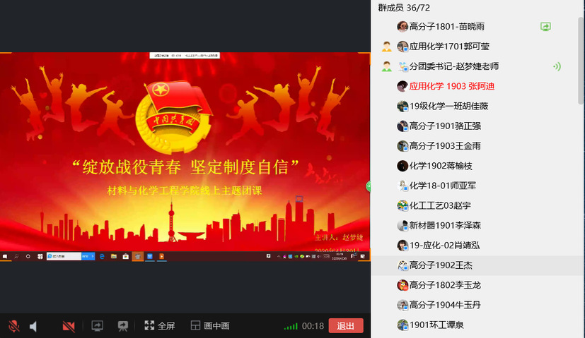 为认真贯彻落实习近平总书记给北京大学援鄂医疗队全体“90后”党员的回信精神,进一步坚定制度自信,明确作为新时代青年学子的责任与担当,4月30日,材料与化学工程学院开展“绽放战疫青春,坚定制度自信”线上主题团课。
