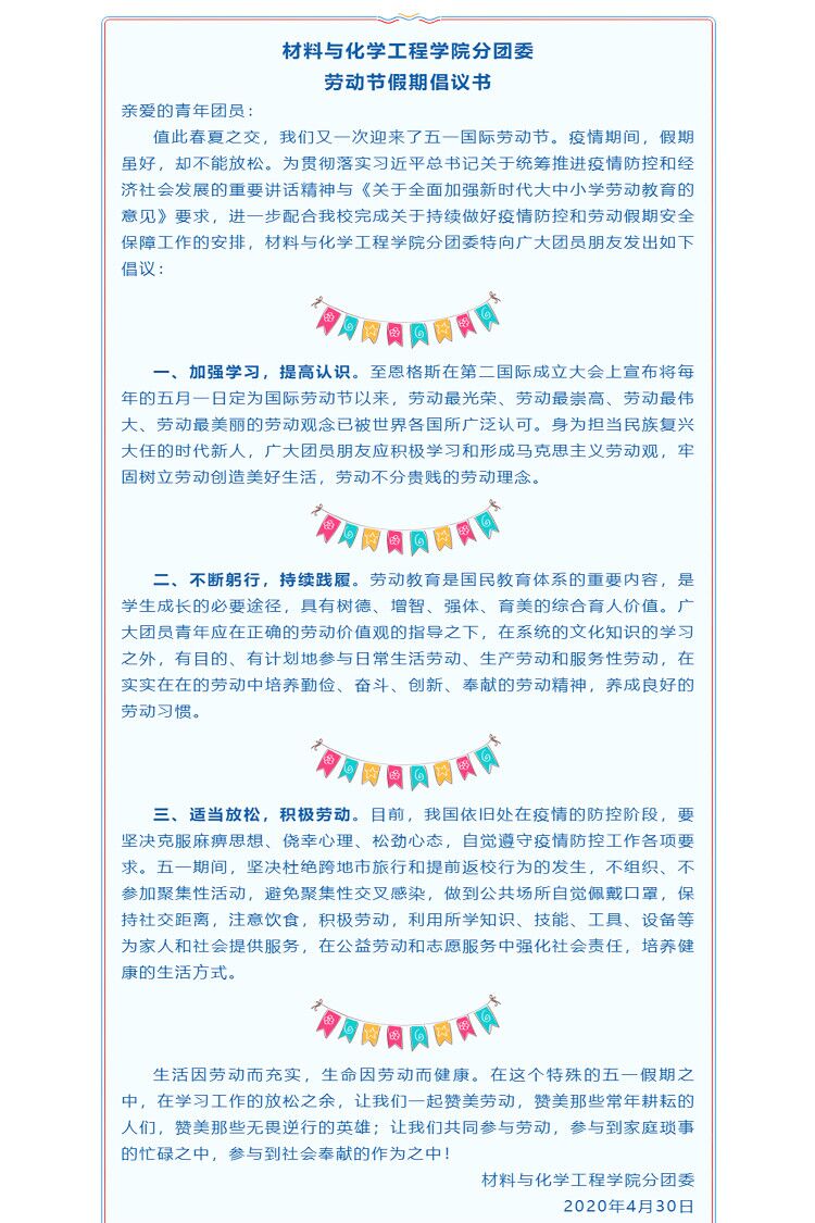 为贯彻落实习近平总书记关于统筹推进疫情防控和经济社会发展的重要讲话精神与《关于全面加强新时代大中小学劳动教育的意见》要求,进一步配合我校完成关于持续做好疫情防控和劳动假期安全保障工作的安排,材料与化学工程学院通过微信公众平台发布《劳动节假期倡议书》,将劳动教育深深植入树德、增智、强体、育美的综合育人理念,倡议大家牢固树立劳动创造美好生活,劳动不分贵贱的劳动理念,不断躬行,持续践履。活动过程中,各班生活委员通过QQ群等线上方式,组织班级同学进行家务劳动并拍照打卡,同学们积极参与到活动中并及时上传劳动照片。一张张照片充分体现出材化学子奋发向上,热爱劳动的精神风貌。最后,同学们在班级群中积极讨论劳动心得,并纷纷表示今后会大力弘扬劳模精神,争做时代先锋,将中华民族的传统美德继续传承下去。