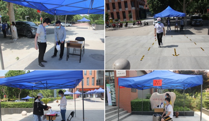 下午2:00演练正式开始,由学院本科生志愿者模拟返校学生,工作人员严格按照《材料与化学工程学院疫情防控期间返校复学实战演练方案》,对学生进出化工楼、实验教学开展、研究生复试等场景进行实战演练。演练内容涵盖了行李消毒、测量体温、更换口罩、身份验证、行程查验、查验健康码、突发事件应急处理等环节。在突发事件应急处理演练过程中,全景模拟了学生在入楼检测和实验室内出现异常情况的处置,演练内容包含疑似症状同学的隔离、转移、信息上报、接触区域及接触人员排查、现场其他同学的安置及心理疏导等。