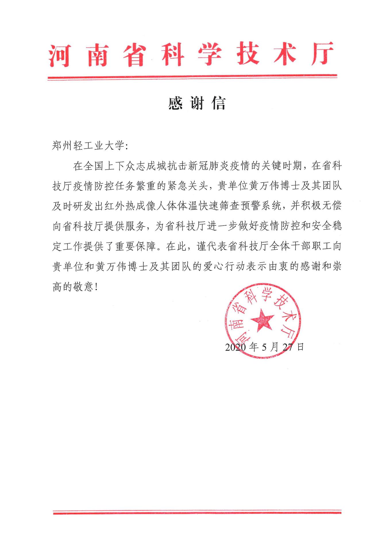 信中说到,在全国上下众志成城抗击新冠肺炎疫情的关键时期,在省科技厅疫情防控任务繁重的紧急关头,黄万伟博士及其团队及时研发出红外热成像人体体温快速筛查预警系统,并积极无偿向省科技厅提供服务,为省科技厅进一步做好疫情防控和安全稳定工作提供了重要保障。为此,省科技厅全体干部职工向我校和黄万伟博士及其团队的爱心行动表示由衷的感谢和崇高的敬意。