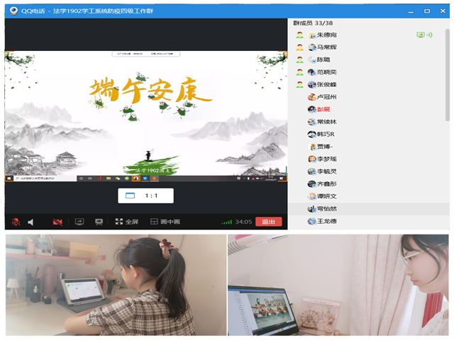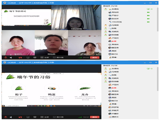 各班级同学积极踊跃参与,利用网络平台,开展线上端午民俗文化讲解、经典诗词诵读、端午节美文鉴赏、端午手工制作等形式多样、内容丰富的活动。法学1902班开展线上普及端午节历史文化、主题经典诵读活动,在诵读中共同体验古意之美,歌颂伟大爱国主义诗人屈原,彰显中华民族的崇高气节和爱国主义精神。公管1901班组织同学们在线上分享家乡端午节习俗,线上展示了包粽子、做香囊、挂艾草等端午节民俗,在活动中逐渐加深了对我国端午节的理解,传递着对中华民俗的热爱。