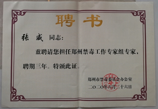 为深入推进禁毒工作,郑州市禁毒办组建了郑州市第一批禁毒工作专家组。首批邀请的专家分别来自毒品预防宣传教育、毒品犯罪心理行为认知、毒品原植物识别、戒毒特殊心理修复、吸毒成瘾机理认定等专业领域,专家组成员共5名,张威博士是其中唯一一名高校领域专家。