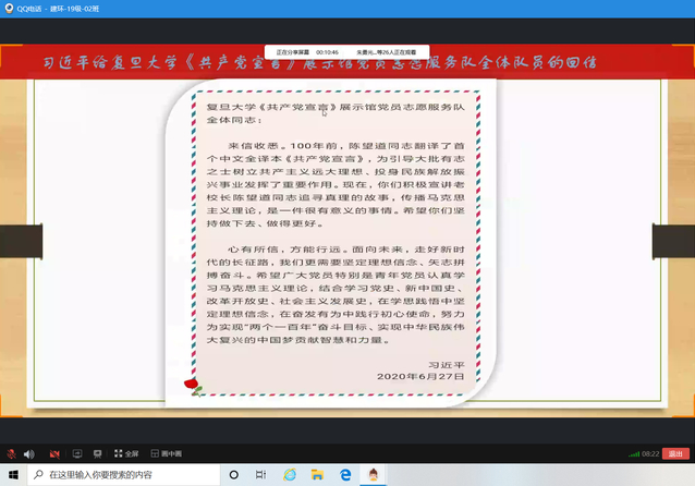 为庆祝中国共产党成立99周年,深入学习习近平总书记给复旦大学青年师生党员的回信精神,6月30日-7月2日,建筑环境工程学院各团支部积极开展“学习习近平总书记给复旦大学青年师生党员的回信精神”线上主题团日活动。