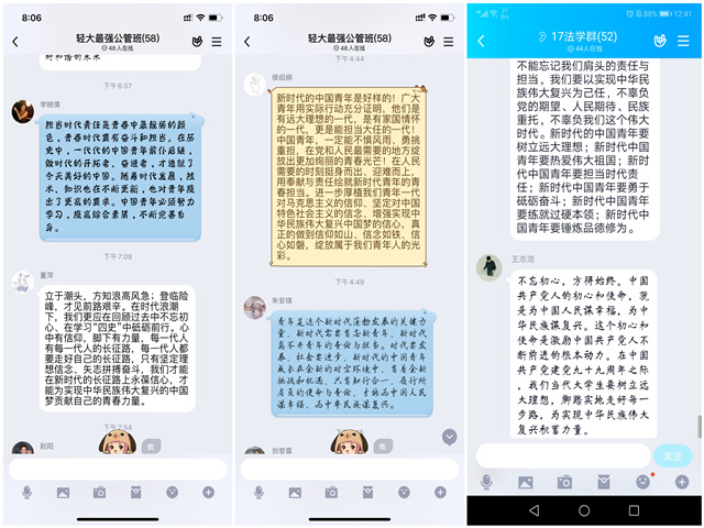各班级团支部带领全体团员共同学习了习近平总书记的回信内容,并展开线上讨论研讨,分享交流学习心得。习近平总书记强调,心有所信,方能行远。面向未来,走好新时代的长征路,我们更需要坚定理想信念、矢志拼搏奋斗。希望广大党员特别是青年党员认真学习马克思主义理论,结合学习党史、新中国史、改革开放史、社会主义发展史,在学思践悟中坚定理想信念,在奋发有为中践行初心使命,努力为实现“两个一百年”奋斗目标、实现中华民族伟大复兴的中国梦贡献智慧和力量。