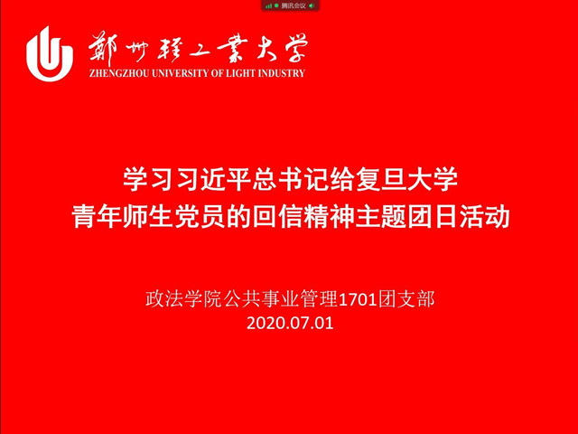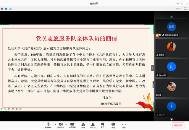 习近平总书记近日给复旦大学《共产党宣言》展示馆党员志愿服务队全体队员回信,勉励他们继续讲好关于理想信念的故事,并对全国广大党员特别是青年党员提出殷切期望。7月1日——4日,政法学院组织各班级团支部开展“学习习近平总书记给复旦大学青年师生党员的回信精神”线上主题团日活动。