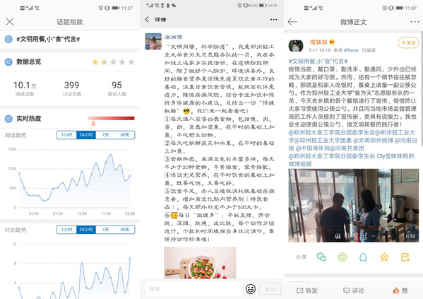 倡导文明用餐,健康风尚共宣传。为加大宣传力度,本团队在学院范围内招募100余名分布在全国各地的线上宣讲员,依托微博、QQ、微信,抖音等多个新媒体平台,通过图片、文字、视频等方式向公众传递食品安全知识,倡导健康饮食观念,号召公众安全饮食,文明用餐。活动跨越地域限制,引发广泛关注与讨论,指定微博话题“文明用餐,小‘食’代言”,目前已发布评论近400条,阅读量达10万。