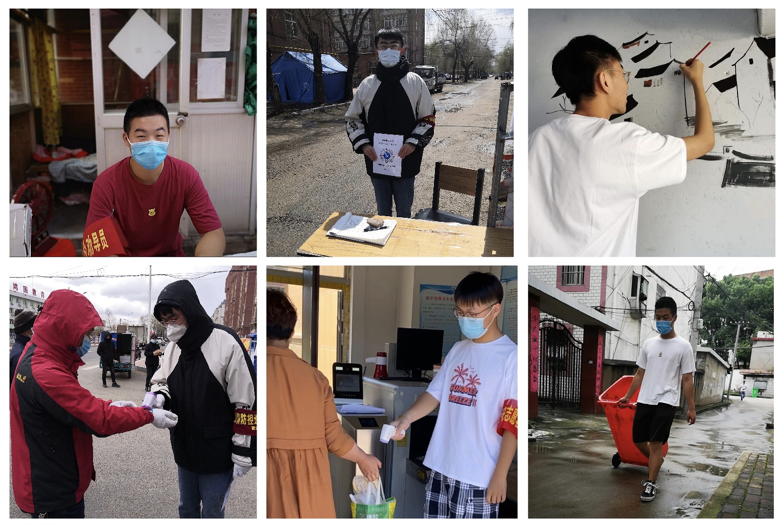 助力疫情防控,共守健康安全。在这个特殊的假期,同学们对于疫情从未松懈,一直忙碌在疫情防控志愿者队伍中,量体温、登记人车往来、与环卫工人一起做消毒清洁,宣讲疫情防控知识,用不怕苦、不怕累的热情和实际行动守护了当地群众的生命健康安全。在工作之余,队员们还不忘宣传环保知识,以墙为体,用笔墨作画,传播生态环保理念。