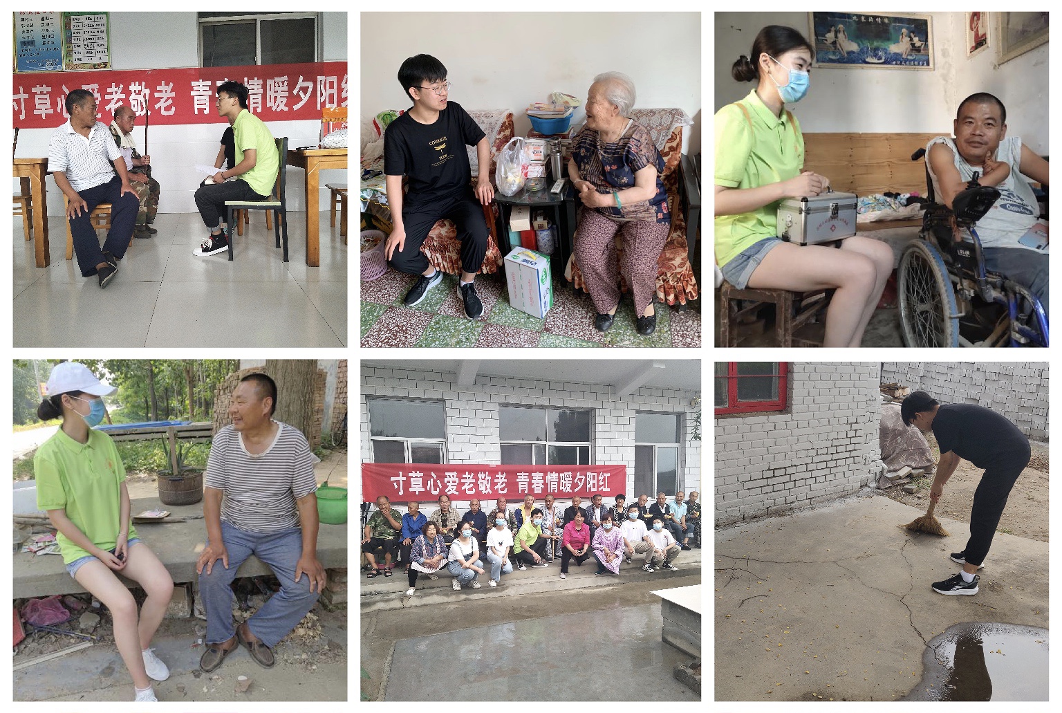 寸草心爱老敬老,青春情暖夕阳红。在河南省商丘市梁园区水池铺乡宋继鲁村等地,实践队员们走进因病致贫家庭,配合医护人员健康义诊,爱心陪聊,传递温暖,为孤寡老人打扫卫生,拔除杂草,让贫困家庭和孤寡老人们感受到了温情与关爱。队员秦政同学带领自己辅导班的学生一起到河南省林州市临淇镇敬老院了解老人需求,帮助打扫卫生,与老人们聊天,让老人倍感关怀的同时,增强了青少年学生的社会责任感,弘扬了中华民族敬老爱老的传统美德。