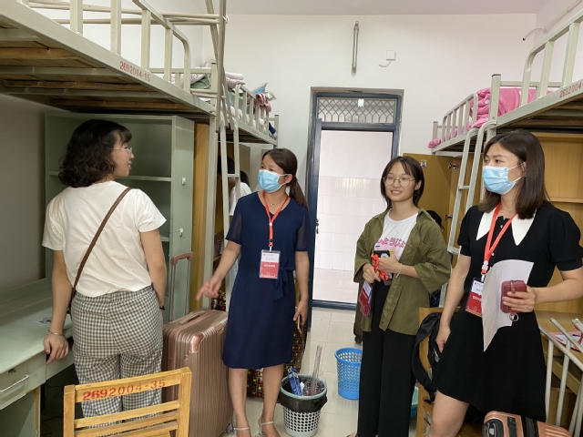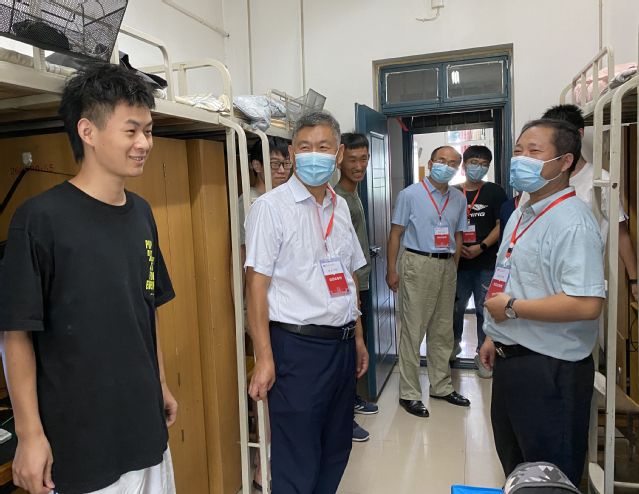 到达新生宿舍后,学院党政领导班子亲切地与新生交谈,了解新生入住情况。党委书记宋德涛询问新生是否适应新的环境,并叮嘱新生要严格遵守学校疫情防控要求和相关规定,在日常生活中要注意安全,提高安全防范意识,如遇困难要及时向辅导员和班主任沟通,以积极的心态和良好的面貌适应大学校园生活。在5号楼642宿舍,院长韩超了解到2020级法学专业王阳同学以专业第二名、超出省控线81分的成绩考入我校并打算继续考研,鼓励他在大学期间认真学习专业知识,为实现梦想继续奋斗。