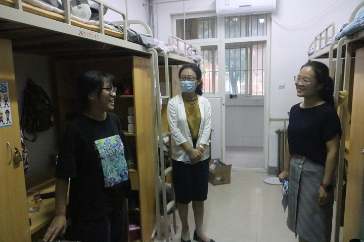 学院领导一行人先后来到各个专业的新生寝室并与新生进行了亲切的交谈,询问同学们的家乡籍贯、到校方式、宿舍设施、饮食习惯等情况,了解同学们到校后的适应情况,耐心解答同学们的疑问,鼓励同学们要认真规划大学生活,好好学习,丰富充实自己的课余生活,尽快融入到材化学院这个大家庭中。同时,提醒大家目前仍处于常态化疫情防控阶段,要严格执行学校的防控管理制度,提高防控意识,做好个人防控,调整心态,以积极健康、激昂向上的状态迎接新的校园生活。