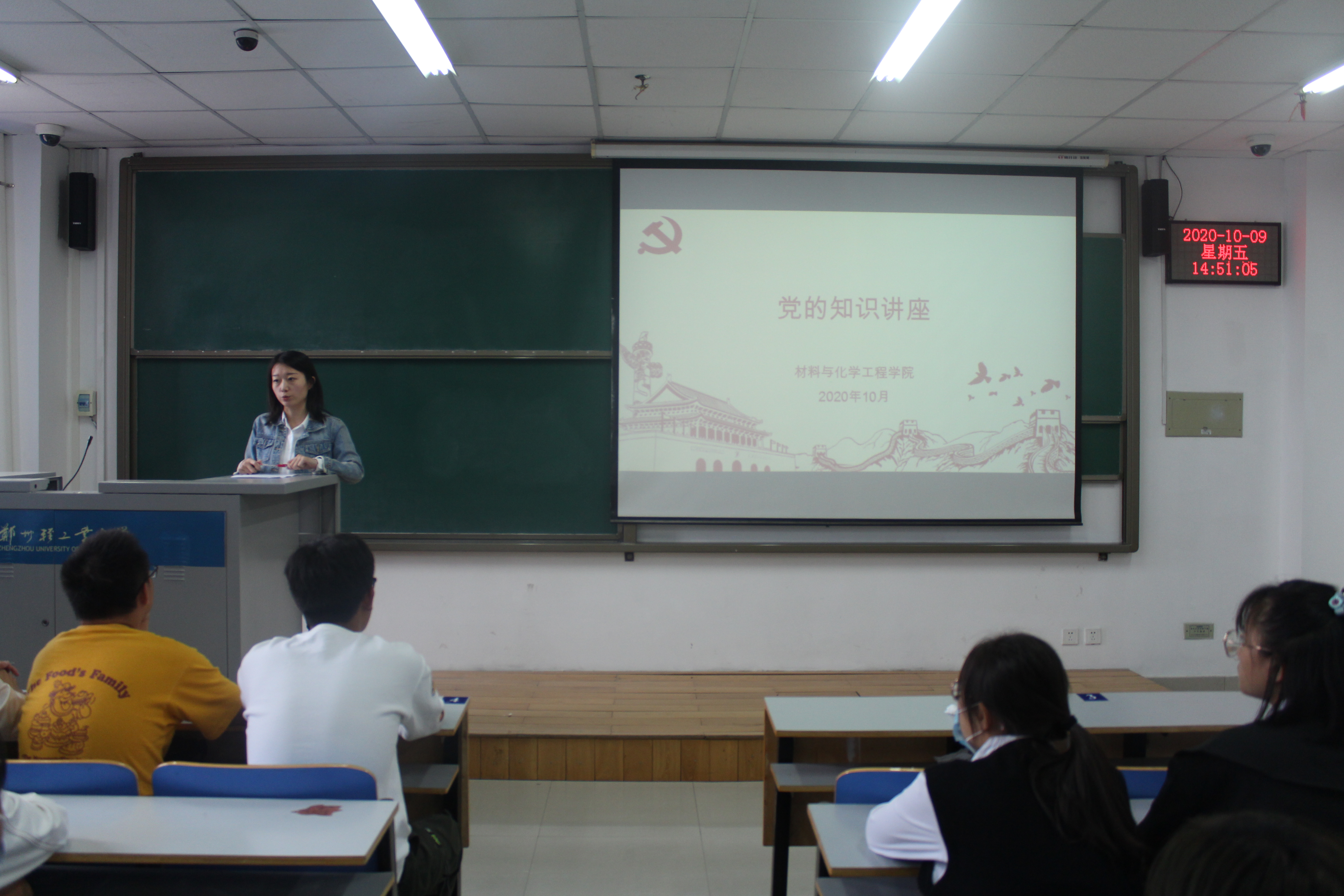 为加深学生对党史国情的深刻了解,激发同学们的爱国情怀,10月9日下午,材料与化学工程学院组织2020级新生进行党的知识讲座。学院负责党务老师程亚芬为同学们讲解党的基本知识。