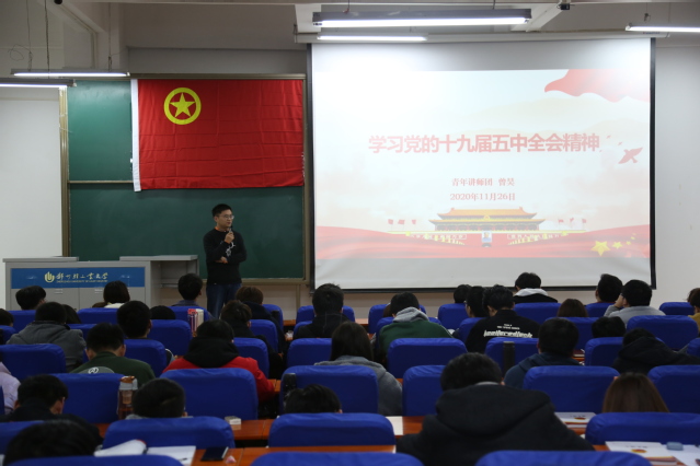 郑州轻工业大学“青年讲师团”成员、校学生会主席团曾昊同学宣讲了党的十九届五中全会精神。在课上,曾昊同学以学生的视角,通过提问互动等方式,以身边实例的加深大家关于党的十九届五中全会所提出的方针与政策的理解,引领学员们积极思考,提高了同学们的思想水平。