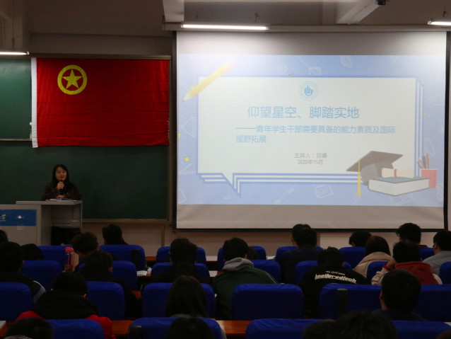 辅导员吕睿老师以“仰望星空,脚踏实地--青年学生干部需要具备的素质能力及国际视野拓展”为题,主要从青年学生干部的自我认知、角色定位、需要具备的素质与能力、新一代青年的责任与使命方面着手,并结合自身经历,为新一代学生干部如何正确爱国、确立人生目标、提升国际视野,努力成长为社会主义合格建设者和可靠接班人提供思路。