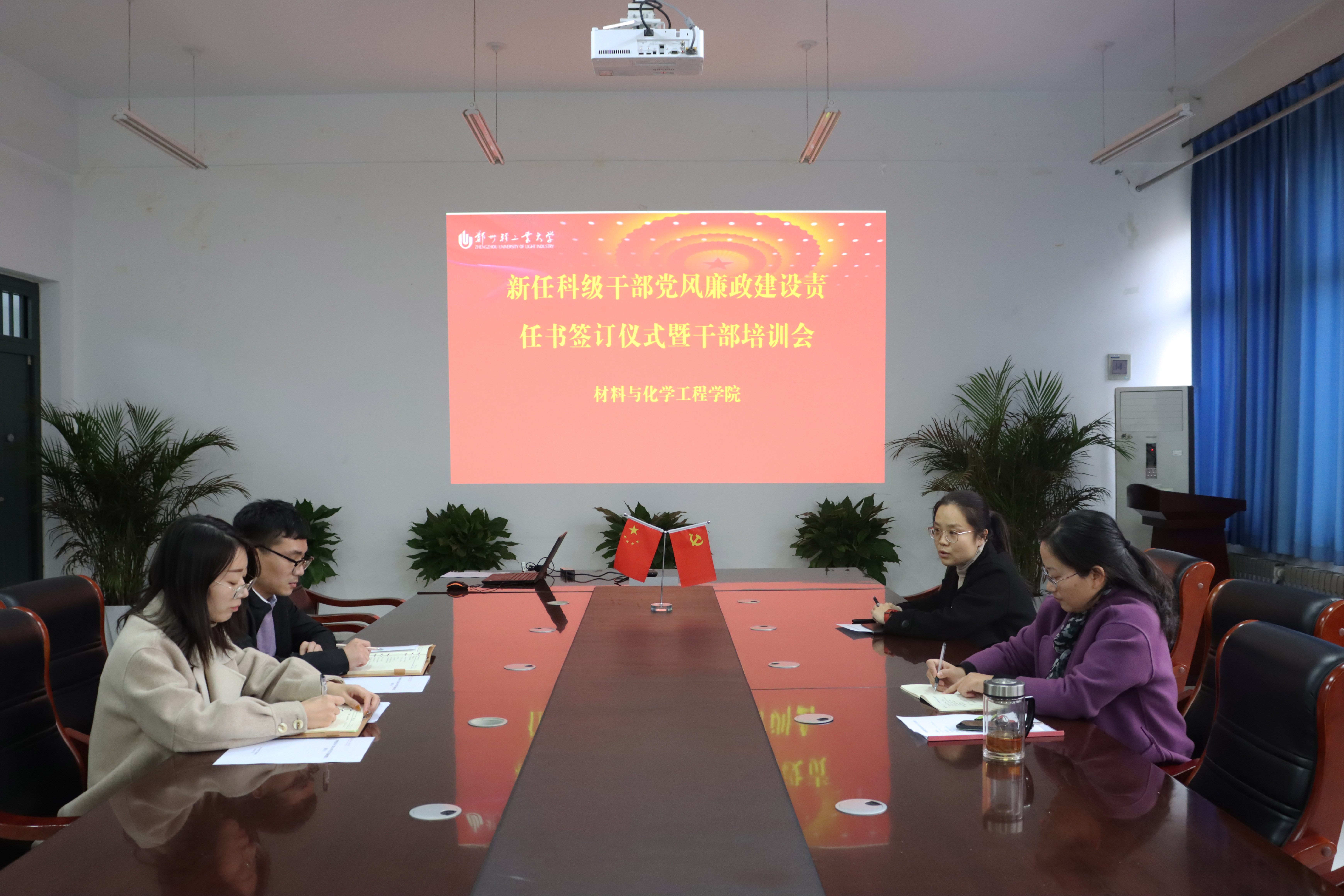 12月4日下午,材料与化学工程学院在化工楼222会议室召开新任科级干部党风廉政建设责任书签订仪式暨干部培训会。会议由学院党委书记常亮主持。