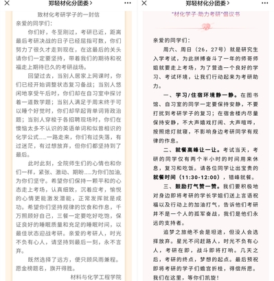 倡议营氛围。学院通过微信平台推送了致材化考研学子的一封信,并向全体学生发送“材化学子•助力考研”倡议书,为考研学子营造一个良好的学习环境、考试环境,让他们以更好的学习状态和心态完成考研最后阶段的冲刺。