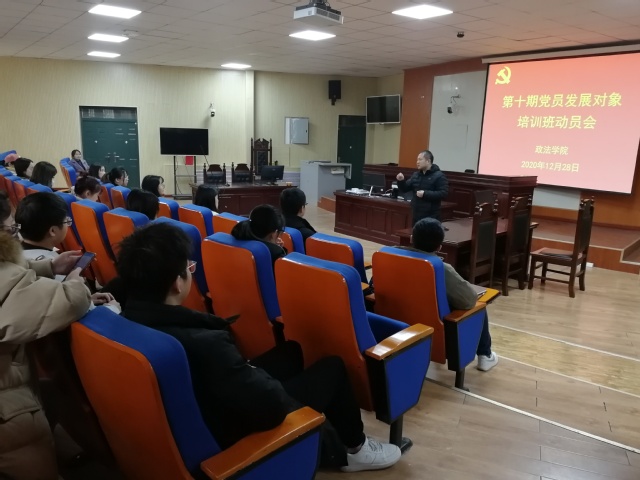 12月28日上午,政法学院在政法楼102室举行第十期党员发展对象培训班动员会,学院党委书记宋德涛、党委副书记刘放美、组织员匡竞以及全体党员发展对象参加。