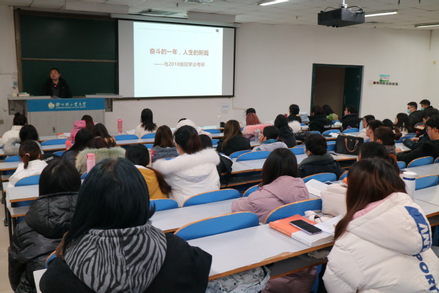 会上,宋德涛书记以“奋斗的一年,人生的新篇”为主题,从为什么考研、怎么去考研、考研的建议、往年考研情况分析、考研的利好政策五个方面讲解了考研学校专业导师选择、考研资料信息搜集,并结合学院专业特色分析了近三年学院考研情况,从考研意向率、报考率、最终考研率出发,深入分析考研的优势与劣势,详细讲解了在准备考研过程中的注意事项和我校对考研成功学子的奖励政策,对同学们选择适合的目标进行了专门指导。他表示考研是为将来更好地就业打下基础,考入双一流大学能够受到的教育更优质,学历的认可度更高,未来的选择会更多。他希望同学们要树立远大理想,提早做打算、定目标,努力寻求能够施展个人才能的更大空间,为将来成为国家栋梁之才、实现人生梦想而不懈奋斗。