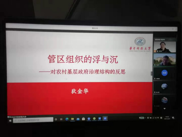 2月9日下午,应政法学院邀请,华中科技大学博士生导师狄金华教授在线上作了题为《管区组织的浮与沉——对农村基层政府治理结构的反思》的学术报告。政法学院社会工作系、公共管理系、社会保障系全体教师聆听了此次讲座,会议由副院长代志明教授主持。
