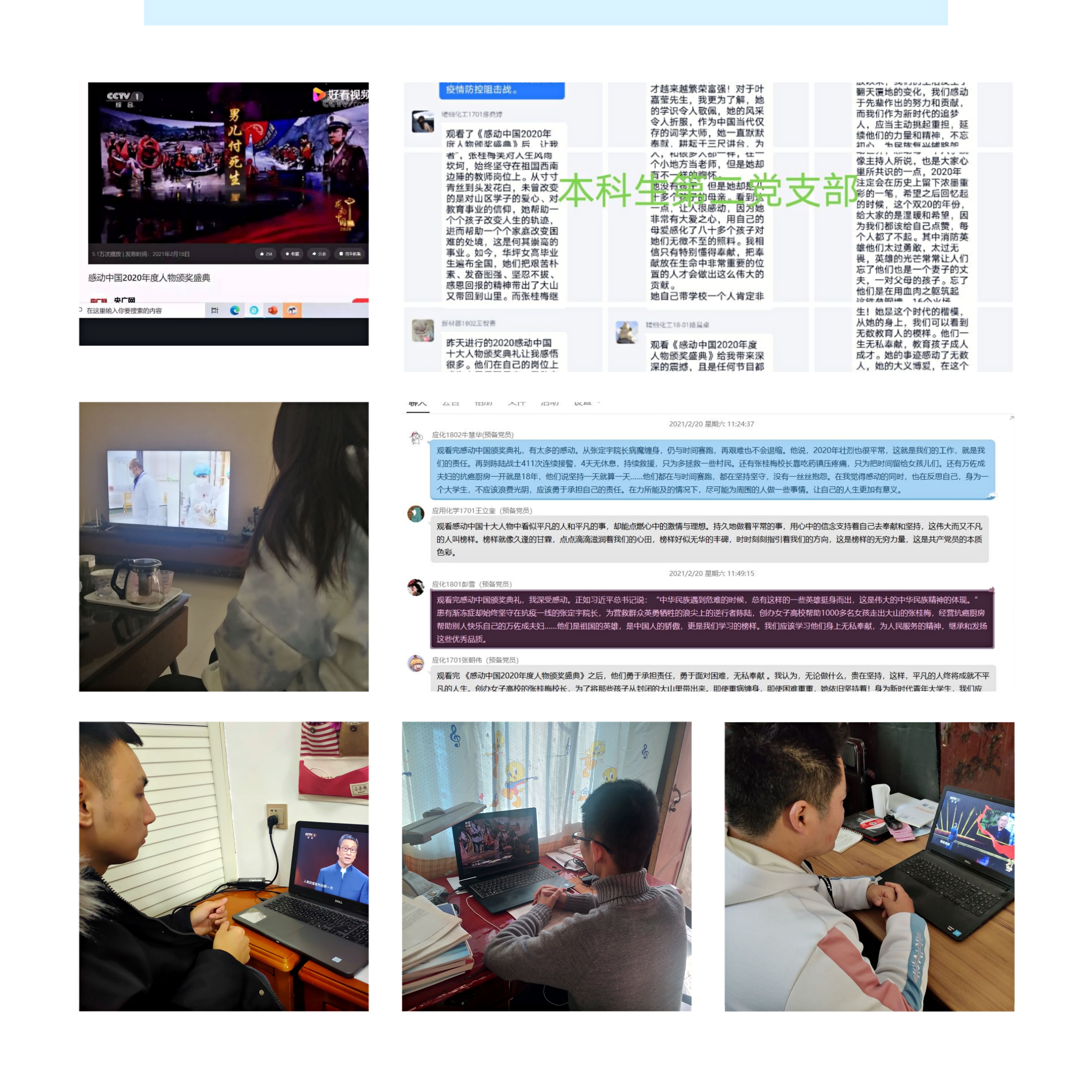 为学习党员先锋精神,弘扬爱国主义情怀,树立榜样力量,增强学院党风建设,材料与化学工程学院学生党支部组织党员和积极分子观看感动中国2020年度人物颁奖盛典。