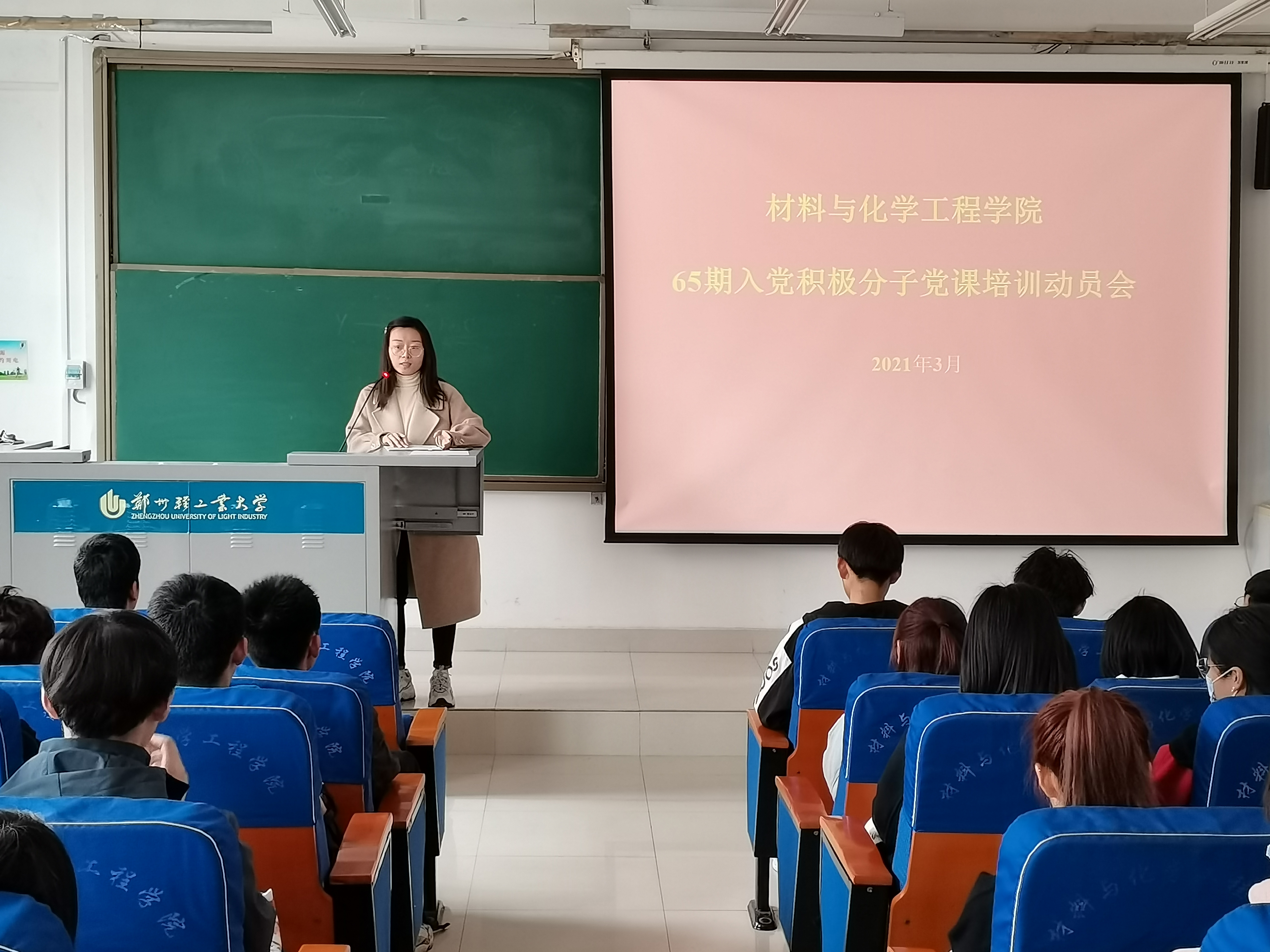 为进一步加强学生党员队伍建设,提高入党积极分子的党性修养,提升党员的整体素质和发展党员工作质量,3月17日上午,材料与化学工程学院在化工楼218室召开第65期入党积极分子党课培训动员会,全体65期入党积极分子参加了本次动员大会。会议由程亚芬老师主持。