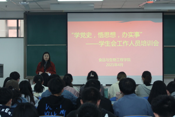 为进一步强化学生会作风建设,提升服务意识,引导学生骨干学党史,悟思想,办实事,4月23日中午,食品与生物工程学院在二教楼816室举行学生会工作人员培训会。学院团委书记李燕老师、全体学生会工作人员参加了此次会议。