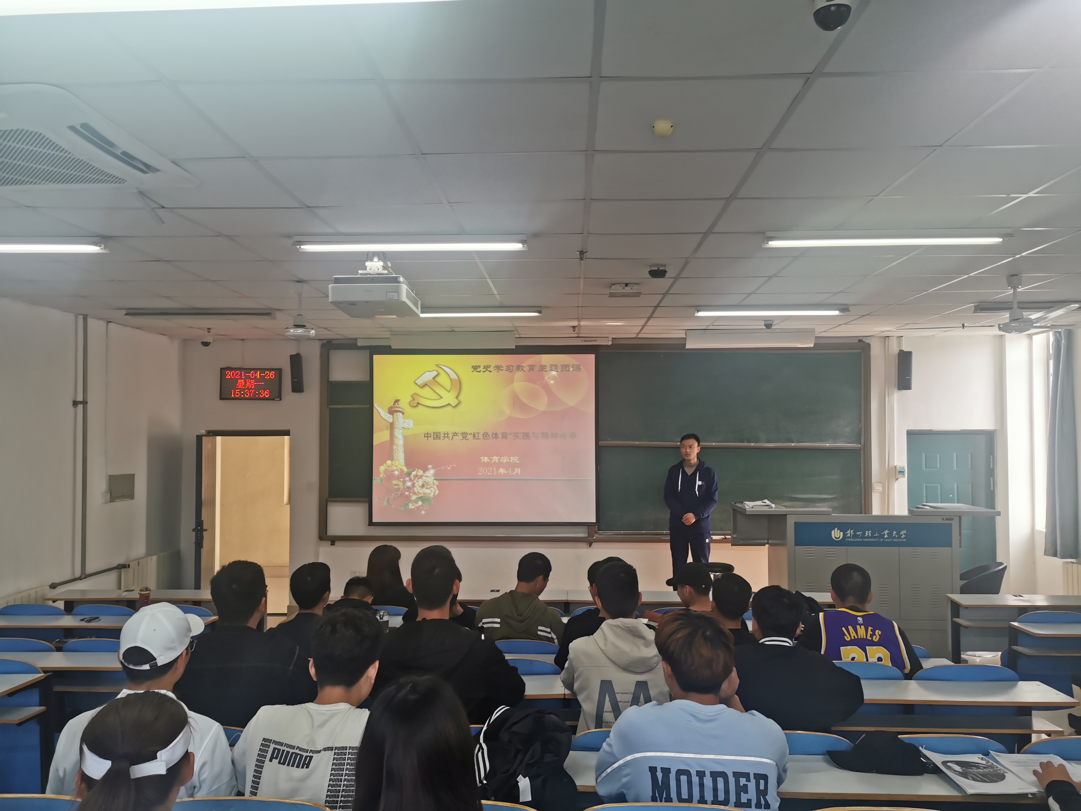 本次主题团课由体育学院团委书记石庆福主讲,团课的主题是“中国共产党红色体育实践与精神传承”。在团课中。石老师首先带领大家共同学习了中国共产党百年体育实践不同的历史时期,并结合鲜活生动的案例,介绍了中国共产党“红色体育”的由来以及“红色体育”的内涵、时代特征和历史意义。石老师深入讲述了“红色体育”精神的凝练——中华体育精神的传承与历史意义,在回望历史的同时,激发团员青年们展开对奋进新时代的思考。最后,石老师要求。全体团员青年要在党史学习教育中学有所思、学有所得,坚定信念跟党走。