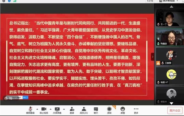 各基层团支部共同观看了习近平总书记在清华大学考察的新闻视频资料,认真学习了习近平总书记的重要讲话精神。习近平总书记深情寄语“当代中国青年是与新时代同向同行、共同前进的一代,生逢盛世,肩负重任”,对广大青年提出爱国爱民、锤炼品德、勇于创新、实学实干的重要要求。习近平总书记的重要讲话在广大团员青年中引发热烈反响,同学们在学习中深刻领会蕴含的丰富内涵和精神实质,并交流学习体会。大家纷纷表示,习近平总书记的重要讲话精神充分体现了我们党对青年一代的一贯重视和殷切关怀,青年一代应听党话、跟党走,在奋进新征程的生动实践中创新业、建新功,牢记青春使命、矢志奋斗报国。