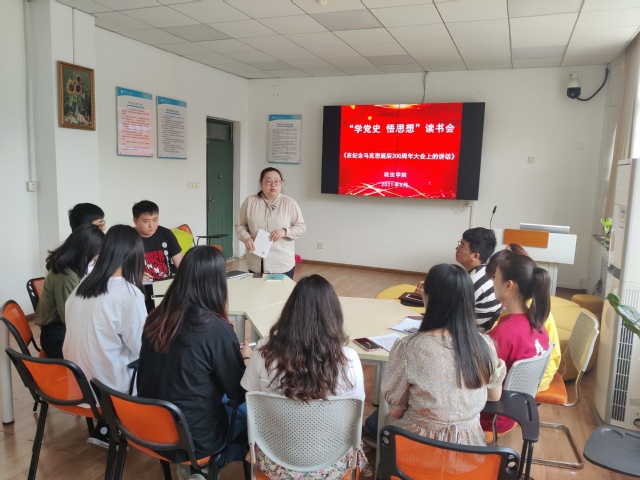 为庆祝中国共产党成立100周年,推进党史学习教育,511日下午,政法学院组织学生党员在政法楼103室开展以“学党史,悟思想”为主题的读书会,本次选读的书目是习近平总书记《在纪念马克思诞辰200周年大会上的讲话》,读书会由本科生第一党支部书记栗想主持。