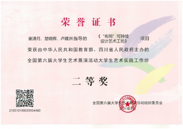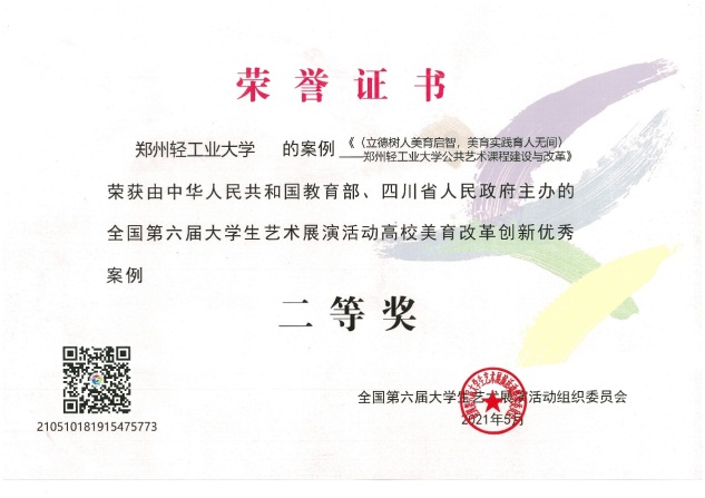 在此次活动中,我校参展项目及作品获得了良好的成绩。艺术教育中心提交的美育改革案例获得全国美育改革创新案例二等奖,艺术设计学院的《“布同”可持续设计艺术工坊》获全国大学生艺术实践工作坊二等奖,杨波同学的微电影作品获二等奖,学校荣获优秀组织奖。我校在获奖数量和品质上均取得了前所未有的突破,位居河南高校前列,这是对我校美育教育成果的积极肯定和艺术教育实践的极大激励,必将对我校美育教育工作产生深远的影响。