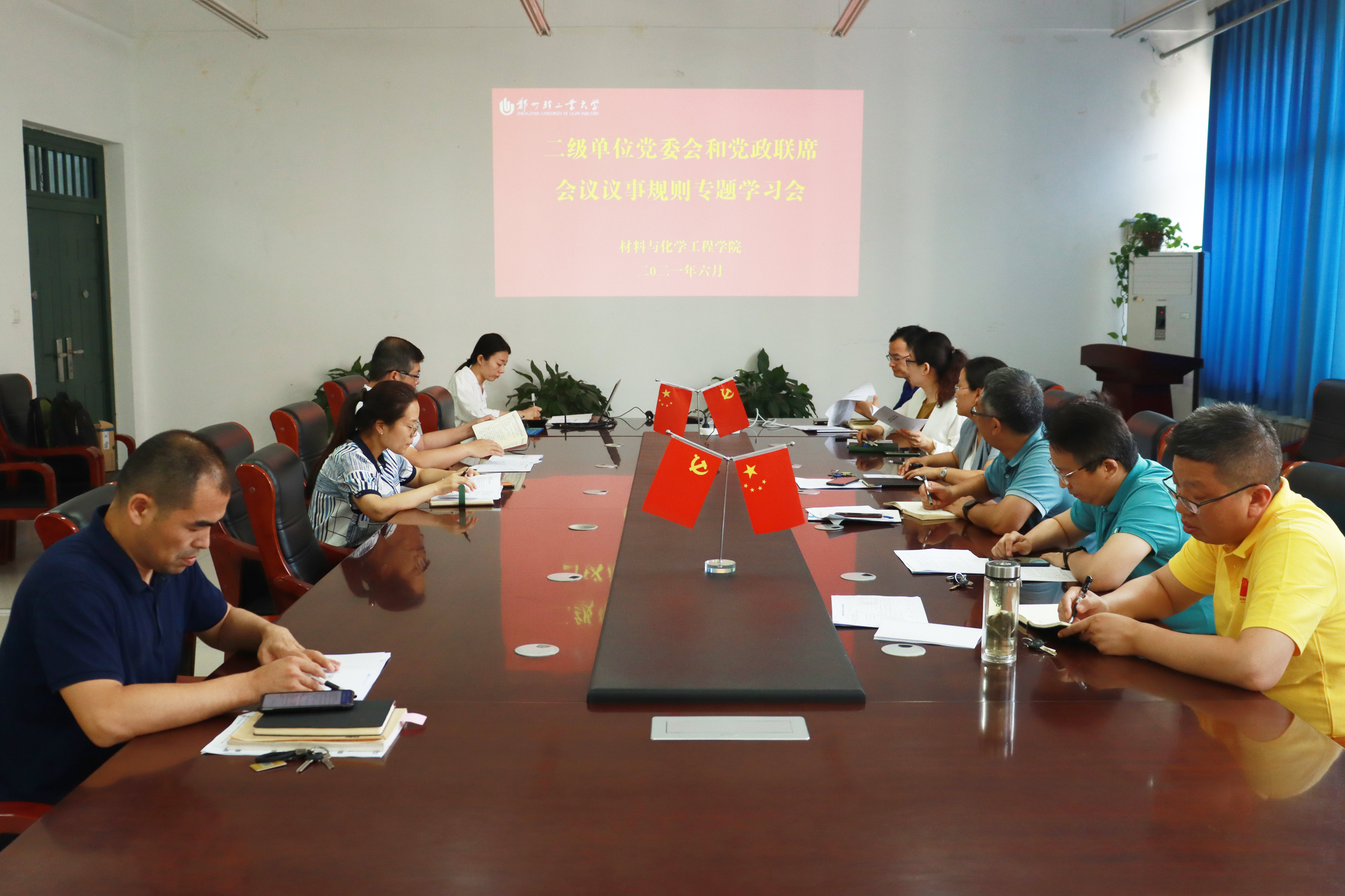 6月18日下午,材料与化学工程学院在222会议室召开二级单位党委会和党政联席会议议事规则专题学习会。学院领导班子、党政办公室主任、专职组织员参加本次会议。会议由学院党委书记常亮主持。