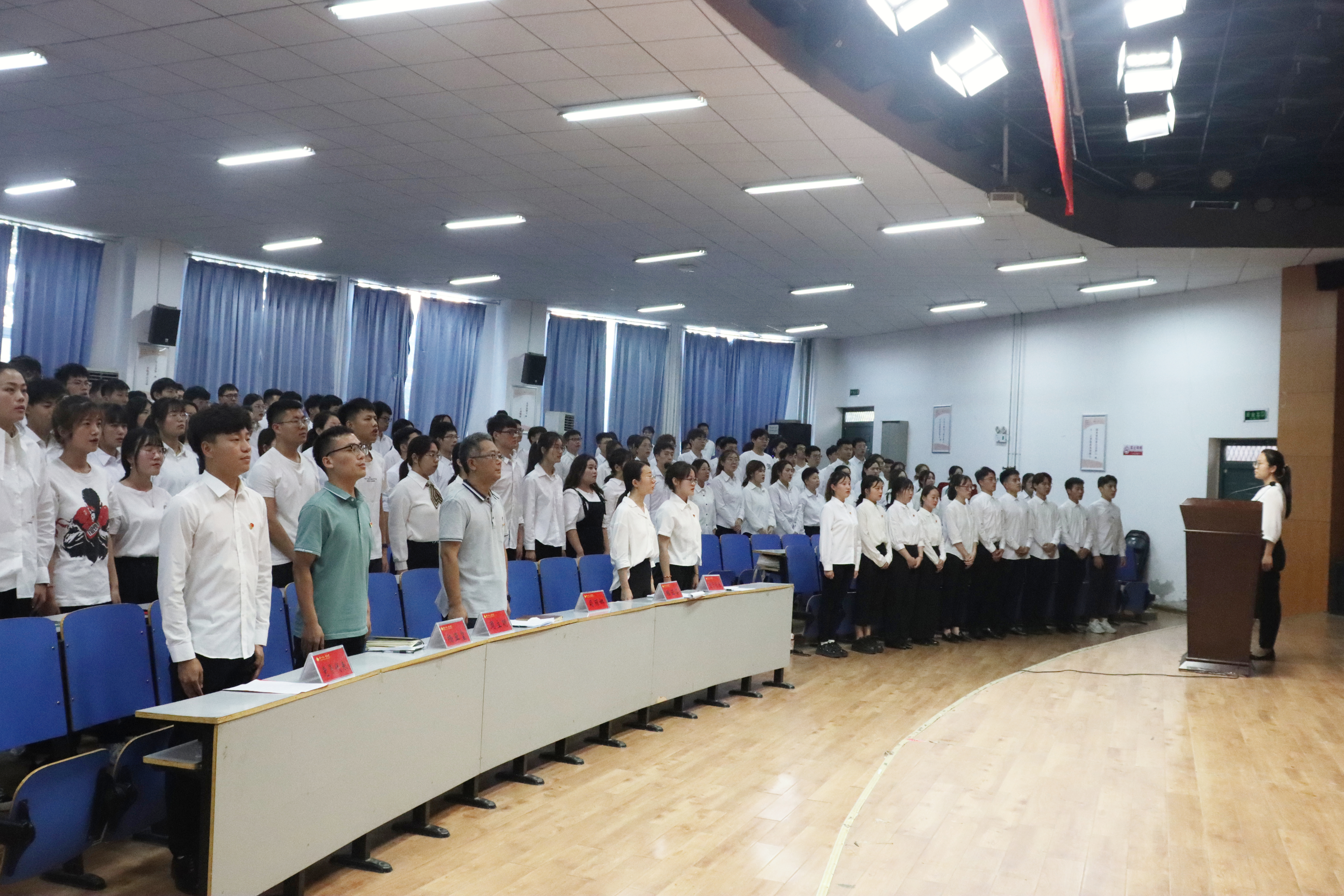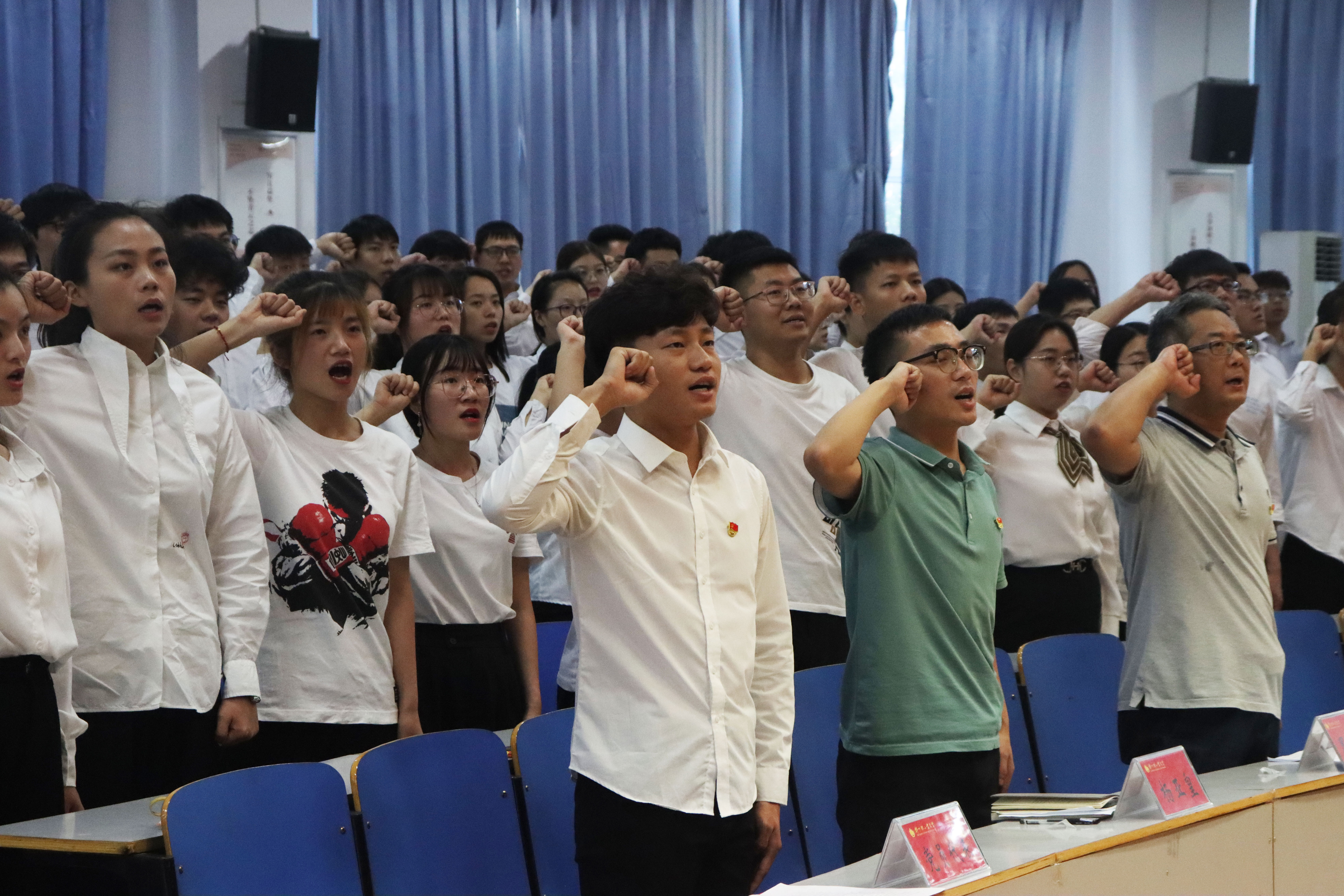 在鲜红的党旗下,庄严的国际歌声中,宣誓仪式正式开始。首先由组织员程亚芬宣读176名学生党员名单;周立明、司丽娜为党员代表佩戴党员徽章。接着,与会党员在司丽娜的领誓下,面对鲜艳的党旗,高举右拳,庄严肃穆地重温了入党誓词。铿锵恢弘的誓词,强烈震撼着在场的每一位党员,一字一句,神圣而豪迈,铮铮誓言,体现了党员同志们对中国共产党的无限忠诚,坚定了共产党人终身坚守、矢志不渝的信念。