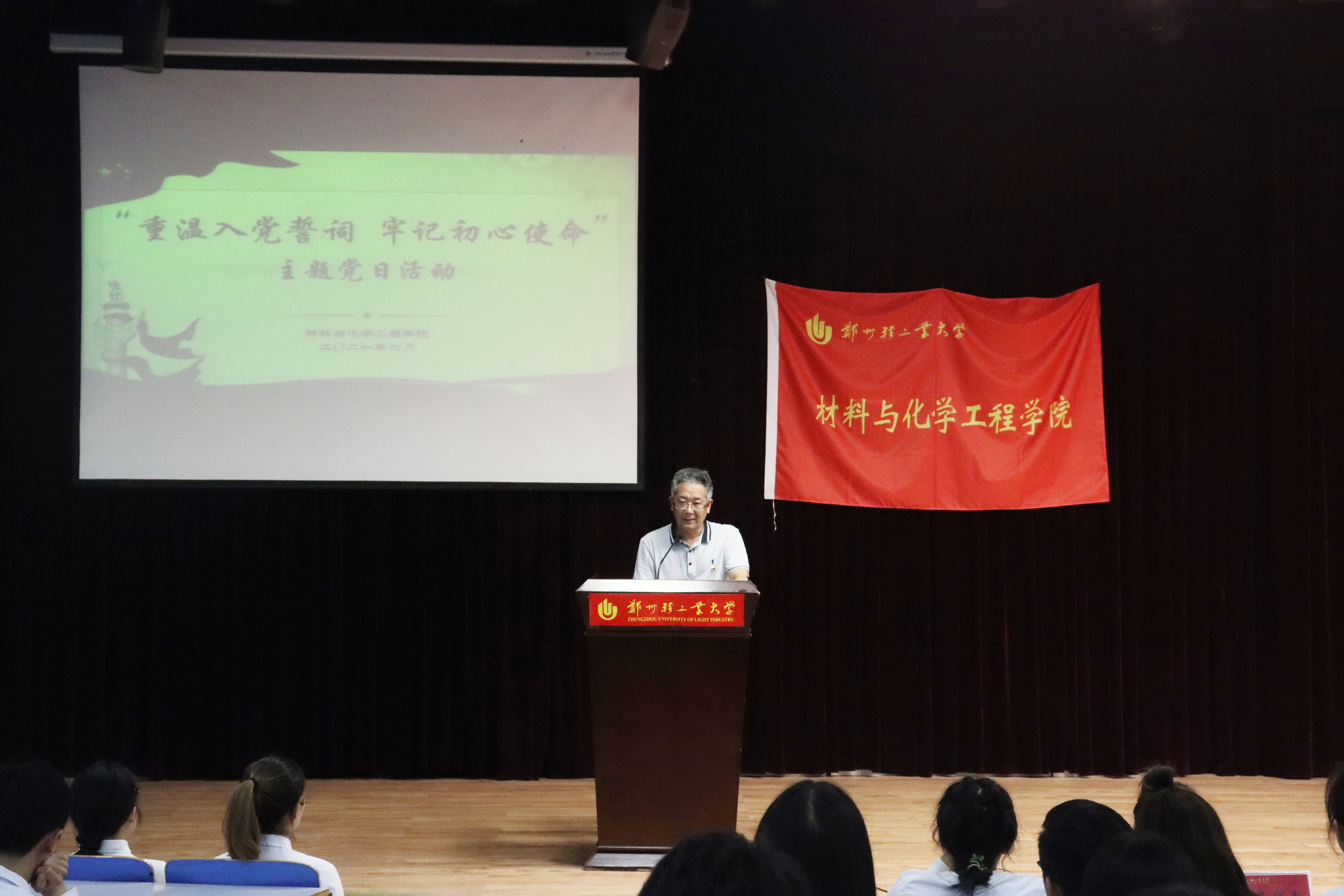 为庆祝中国共产党建党一百周年,提高党员党性修养,增强党员的责任感和使命感,提升组织的凝聚力、向心力和战斗力,6月22日下午,材料与化学工程学院在活动中心208室举行“重温入党誓词 牢记初心使命”主题党日活动。学院院长周立明、学院党委副书记司丽娜、教师代表及全体学生党员参加此次活动。活动由司丽娜主持。