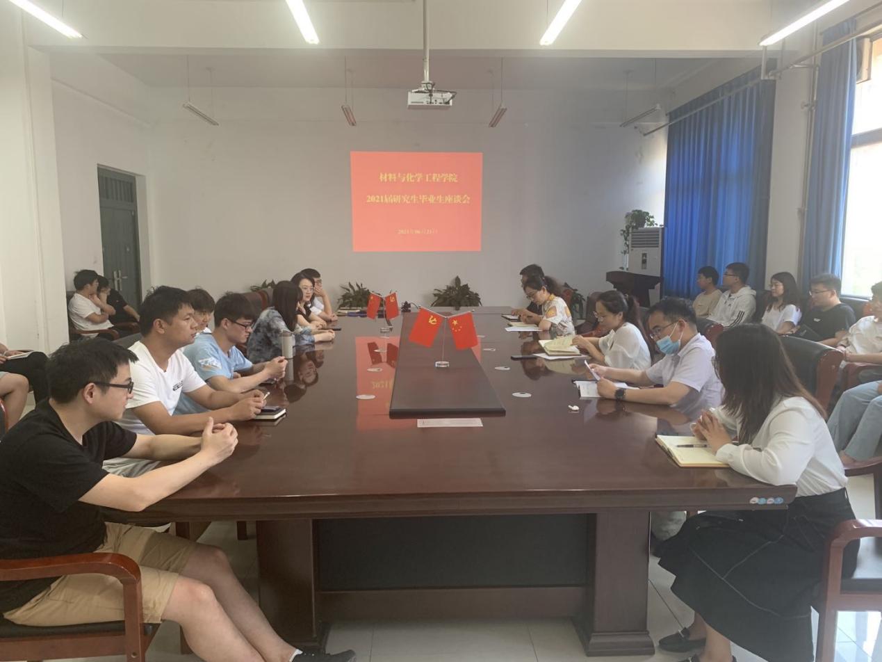 6月21日下午,材料与化学工程学院在化工楼222室召开2021届毕业研究生座谈会。学院领导班子成员、硕士生导师代表以及2021届毕业研究生代表参加了本次座谈。座谈会由学院党委司丽娜主持。