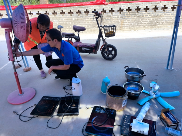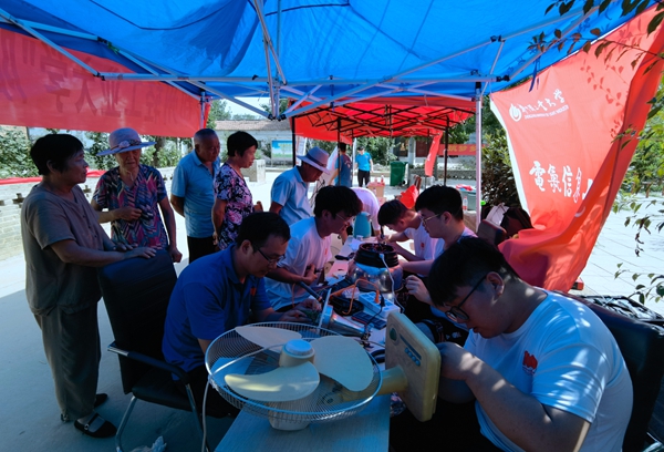 快看,郑州轻工业大学维修家电的大学生又来了!“阳光电气”家电义务维修小分队一下车就引起了村民的注意,不一会就送来了电风扇、电水壶、电磁炉、电吹风等各类家用电器20余件。顾不上长途奔波的疲劳和烈日炎炎的酷暑,志愿者迅速投入工作,仔细检查电器部件,陆续解决了电源接触、线路断路、指示灯不亮等问题,并利用所学知识向村民普及家用电器日常保养及简单故障的排除方法、如何合理使用电器,延长使用寿命。今年是“阳光电气”家电义务维修小分队入驻清东村开展实践活动的第六年,队员们明分工、重协作、抓效率,顺利维修了60余件小家电,志愿者们扎实的专业知识基础、熟练的操作技能、耐心真诚的态度赢得村民的一致好评,用行动践行了当代青年的社会责任,用专业知识助力了乡村振兴发展。