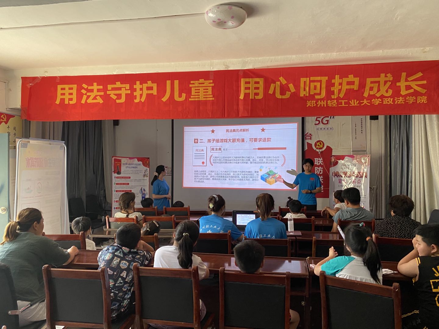 室外,普法宣传讲解进行的如火如荼,室内,普法讲堂同样人声鼎沸。在村支部的活动室,志愿者结合PPT、播放动画,向群众讲解大伙儿最感兴趣的问题:“乡亲们需要啥,我们就讲啥,我们就是来讲乡亲们感兴趣的事,讲乡亲们能听懂的法律。”乡村振兴新形势下,郑州轻工业大学进乡村精准送法,用老百姓的语言讲解与老百姓息息相关的法律知识,让每户家庭、每位群众都接受到法律的沁润,为共同推进乡村振兴战略的实施营造了良好的法治环境。