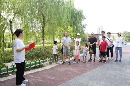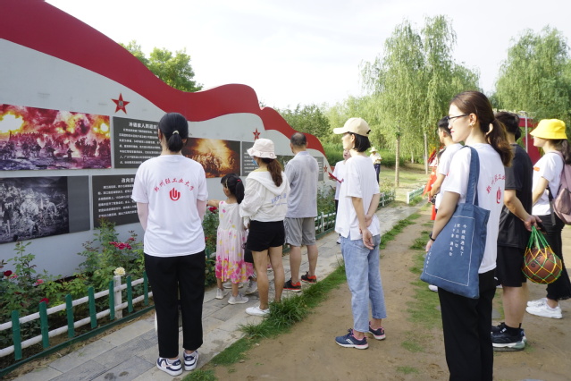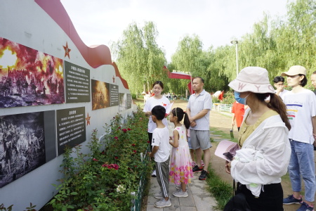活动中,实践队员代育苗同学为前来观光学习的游客讲解了荥阳党建主题公园的历史及公园的红色地标。荥阳党建主题公园借助风景美、人气旺的南水北调渠畔打造而成,主题公园分为“‘一带一路’两馆三广场”。“一带”,即平语近人带,“一路”,即重走长征路;“两馆”,即荥阳党史馆和红色图书馆;“三广场”,即集党旗、宣誓舞台、红色故事电子屏等于一体的“初心广场”,借用剪纸艺术、卡通造型等展示不同时期英雄人物的“小英雄广场”,以及展示8位国家功勋和荥阳市身边模范人物的“先锋广场”。