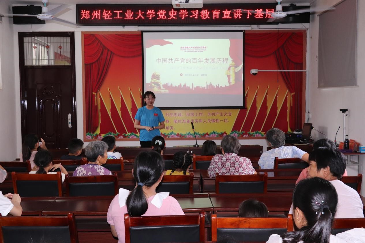 学史以明智,鉴往而知来。为深入开展党史学习教育工作,从百年党史中汲取精神、智慧和力量,推动党史学习教育深入基层、融入群众、深入人心。2021年7月12日下午,郑州轻工业大学学党史宣讲队员赴商水县西赵桥村开展“中国共产党的百年发展历程”宣讲实践活动。