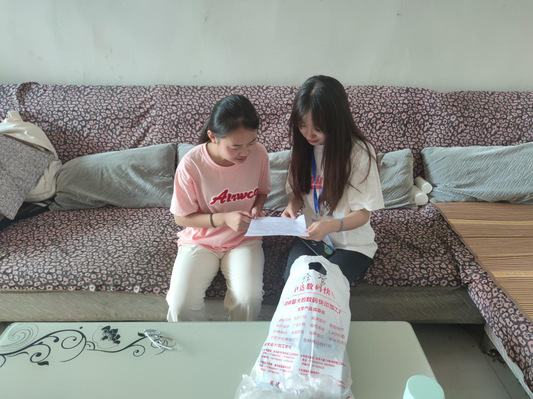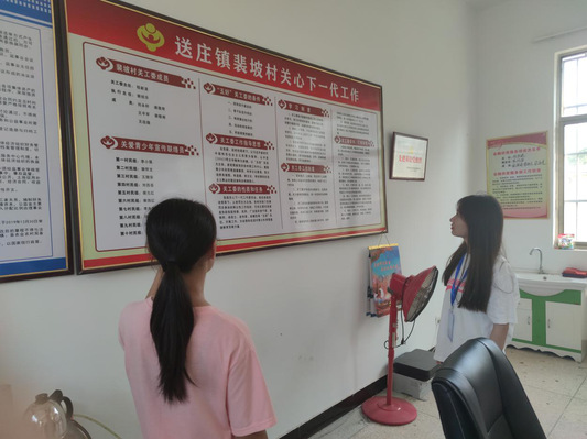 工作人员先带领队员参观了裴坡村的“关心下一代”工作宣传栏,介绍了他们的工作政策。紧接着,队员们向工作人员介绍了郑州轻工业大学学生“六位一体”的奖助政策、河南省高校本专科学生资助政策简历以及高校助学贷款申请指南。工作人员表示现正值毕业期,村镇里也存在部分村民不懂如何操作助学贷款的情况,他们保存了相关资料并表明会在之后向有需求的村民进行政策介绍。
