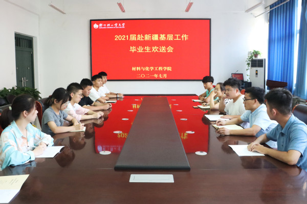 用青春挥洒热血,以奉献铸就成长。7月30日下午,材料与化学工程学院2021届赴新疆基层工作毕业生欢送会在化工楼222会议室顺利举行。学院党委副书记司丽娜、辅导员杨亚皇、十余名在校生代表参加欢送会。