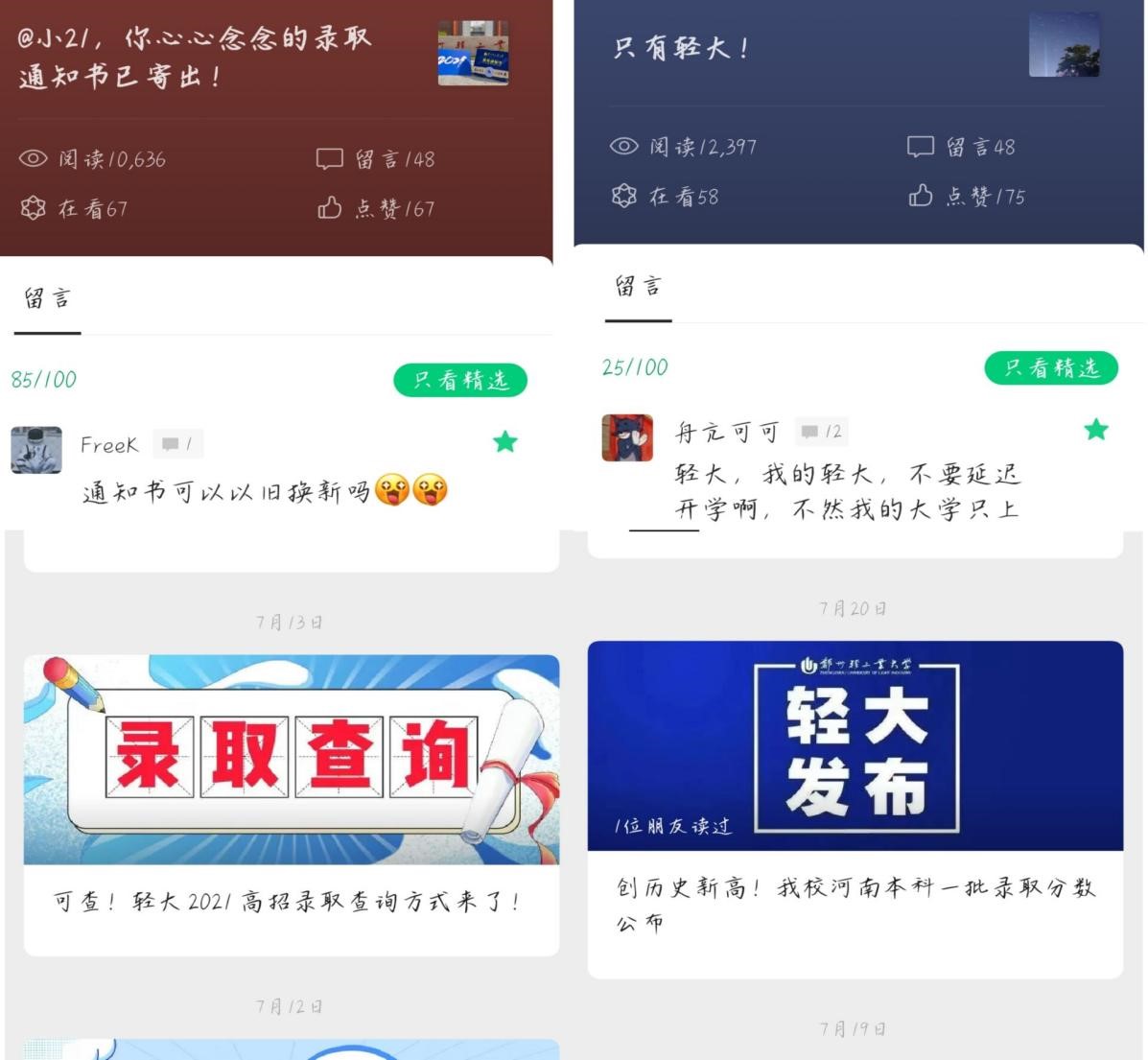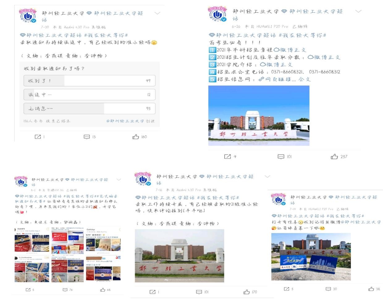 郑州轻工业大学官方微博目前共开设“我在轻大等你”和“掠影轻大”两个话题。其中话题“我在轻大等你”共发布15篇博文,分享学校的招生章程、专业计划等,吸引了很多考生前来了解咨询。话题“掠影轻大”共发布12篇博文,在一张张摄影作品中展示轻大美景,引来众多考生的夸赞和期待。博文最高浏览量达2.2万人次,最高点赞量达171。团队成员在话题里积极为21级新生答疑解惑,介绍校园特色,更有新生“花式晒录取通知书大赛”等互动话题,团队成员将热情给予每一位即将到来的新生,让他们提前对轻大有更多的了解。