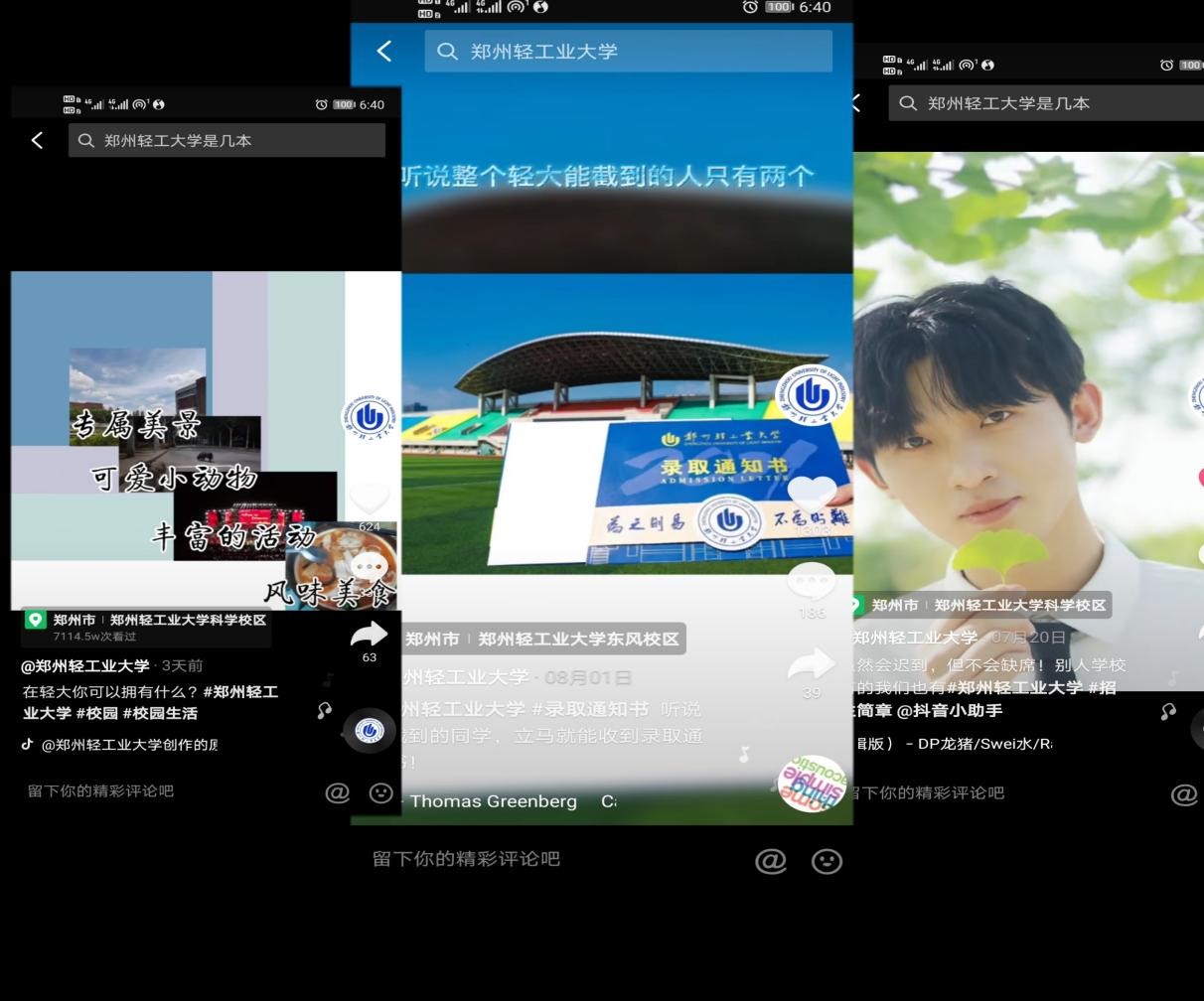郑州轻工业大学官方抖音共发布微视频7条,总浏览量已达121.8万人次,总点赞量达1.6万。其中视频“在轻大你可以拥有什么”的浏览量高达5.2万人次,团队成员在视频中展示学校的美景、美食和宠物,收获了新生们满满的喜爱;视频“欢迎来自各地的小伙伴,期待两个月后的相见”的点赞量高达983,学生及家长在评论区内积极留言,期盼着早日来到校园。