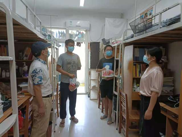 在宿舍,学院老师为每位学生发放了防疫用品口罩和火腿肠、方便面等食品。深入细致地了解了他们在宿舍住宿、饮食等情况,详细询问了同学们在生活、学习的困难情况,还提醒同学们要注意疫情防控、防暑降温和人身安全,保持室内清洁以及日常通风,有困难及时向学院反映。在教室,老师们仔细了解学生考研和法考复习情况,提醒同学们学习要劳逸结合,合理安排时间,掌握科学方法。大家纷纷表示一定会严格遵守学校疫情防控要求,专心学习,积极备考,争取取得优异成绩。