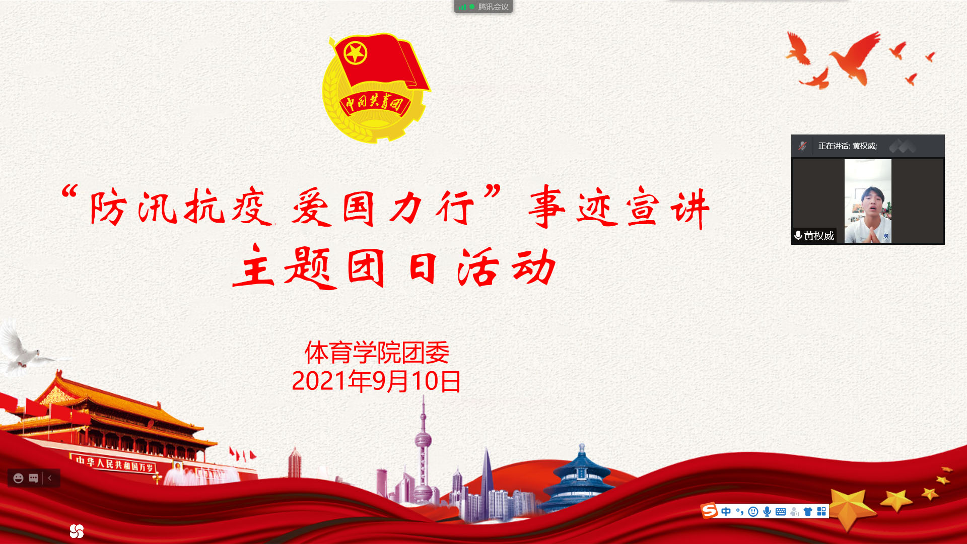 为了宣传青年学子防汛抗疫先进事迹,引领广大青年学子向身边的榜样学习,9月10日上午,体育学院组织开展了“防汛抗疫 爱国力行”先进事迹宣讲主题团日活动。体育学院2021级全体新生团员和高年级团员代表参加了此次活动。