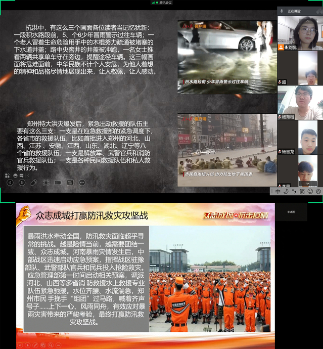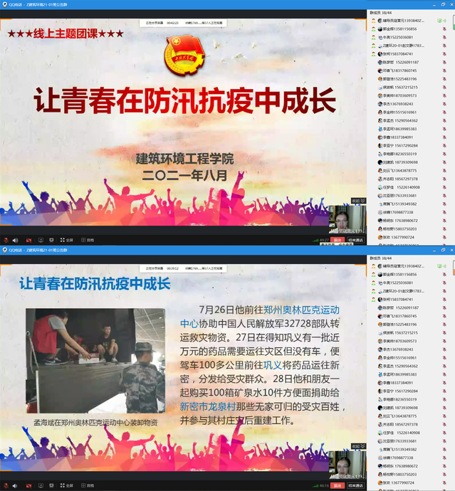 学院团委书记寇誉元为Z建筑环境与能源应用工程21-01班团支部讲团课。团课中,寇老师带领大家回顾了党带领全国人民众志成城抗洪抢险、灾后重建和抗击疫情的艰辛历程,学习了河南省教育厅党组书记、厅长在河南省新冠肺炎疫情防控新闻发布会上的讲话精神,分享了在疫情汛情双重考验下建工学子闻“汛”而动、冲锋“疫”线的青春故事,号召同学们用实际行动诠释跟党初心、用辛勤汗水践行志愿精神,充分展现新时代青年的责任与担当。各班级团支部书记通过PPT、微视频等方式展现了河南省防汛救灾困难重重、灾后重建任务繁重、抗击疫情形势严峻的形势,讲述了暑期防汛抗疫战线上涌现的感人事迹,引导同学们在确保自身安全的前提下积极参与到防汛救灾和疫情防控工作中。