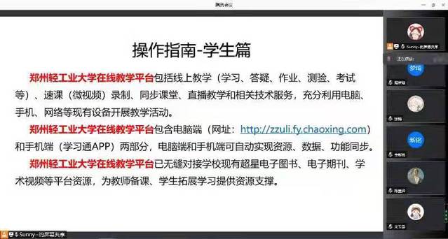 会上,研究生辅导员匡竞具体讲解了郑州轻工业大学在线教学平台的手机和电脑端的登录使用,对进入课程和班级、加入课程方式等方面进行了演示,并对线上学习、观看速课(微视频)学习、同步课堂学习、直播学习四种在线学习方式分别进行了详细介绍。副院长代志明对研究生期间需要用到的一些优秀网络学习平台、慕课资源、论文下载等进行了介绍,建议同学们多登录这些平台开展自主学习,拓宽知识面,提升专业能力。党委副书记刘放美要求同学们认真参与网络课程教学,严格遵守课堂纪律,对同学们登录网络课堂遇到的问题进行了答疑解惑。同学们依据视频讲解、演示的操作步骤,很快能够熟练掌握网络课堂的学习方法。
