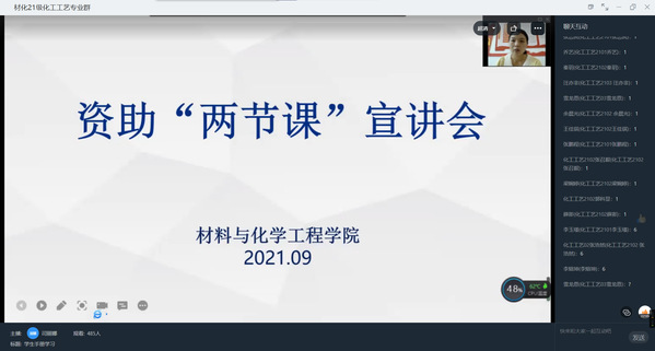 为贯彻落实国家资助政策,进一步做好资助宣传教育工作,9月13日,材料与化学工程学院开展了2021级新生国家资助政策“两节课”线上宣讲会,学院资助工作负责老师李瑞瑞、2021级辅导员及全体2021级新生参加会议。